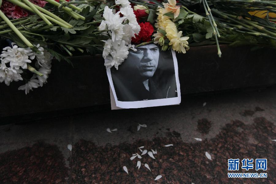 这是3月1日在圣彼得堡举行的游行集会上拍摄的反对派领导人涅姆佐夫的纪念照。当日,人们在圣彼得堡参加游行集会,纪念遇害的反对派领导人涅姆佐夫。涅姆佐夫2月27日晚在红场附近的一座桥散步时遭不明身份人员枪击身亡,俄总统普京要求成立专门小组调查此事,并表示一定要将凶手绳之以法。新华社发(莫京娜 摄)