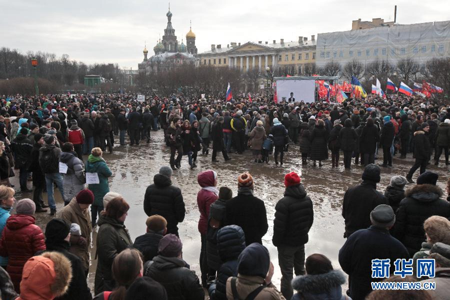 3月1日,人们在圣彼得堡参加游行集会,纪念遇害的反对派领导人涅姆佐夫。 2月27日晚,俄罗斯反对派领导人、前副总理鲍里斯·涅姆佐夫在莫斯科市中心遭身份不明人员枪击身亡。 新华社发(莫京娜 摄)