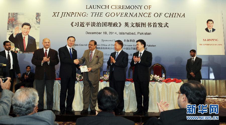 截至2015年1月15日,《习近平谈治国理政》多语种图书的累计发行量达到317.6万册,中国领导人的这部政论文集引起海内外高度关注。 2014年12月19日,在巴基斯坦首都伊斯兰堡,中国驻巴基斯坦大使孙卫东(前排左二)在《习近平谈治国理政》英文版首发仪式上向巴基斯坦总统侯赛因(前排中)赠书。巴基斯坦政界、军界、外交界、学界和媒体记者等近400人参加这一活动。新华社记者黄宗治摄