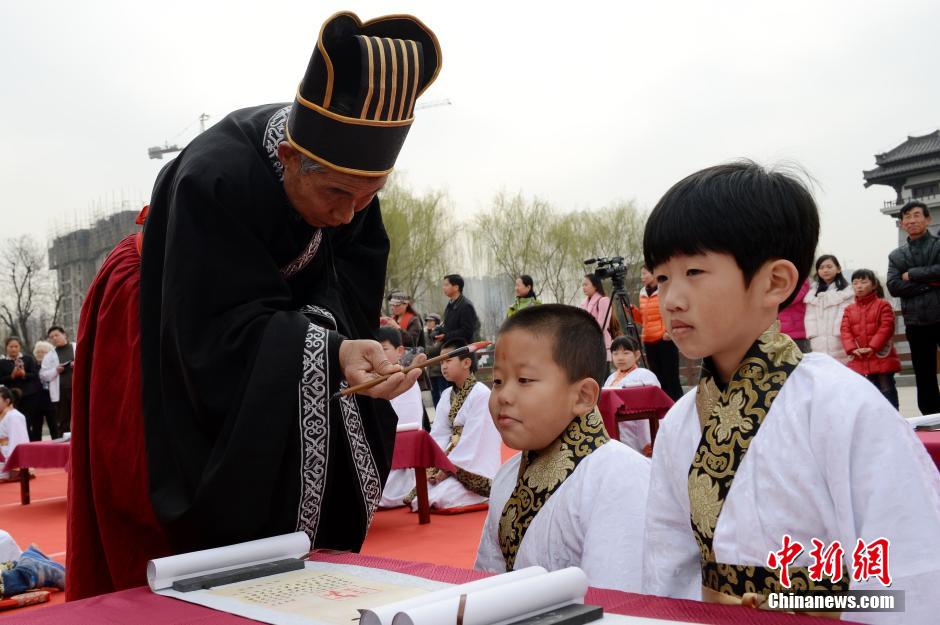 3月1日,50名6至7岁的学龄儿童聚集在西安市汉城湖畔,身穿汉服,隆重举行“开笔礼”。“开笔礼”是中国传统文化中对少儿开始识字习礼的一种启蒙教育形式。古时“开笔礼”是极为隆重的典礼,对每个学童来讲有着重大的意义,是人生四大礼之一。图为朱砂开智。张远 摄