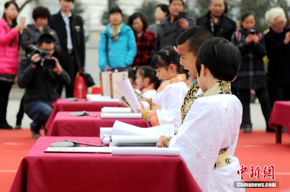 3月1日,50名6至7岁的学龄儿童聚集在西安市汉城湖畔,身穿汉服,隆重举行“开笔礼”。图为诵读经典。张远 摄