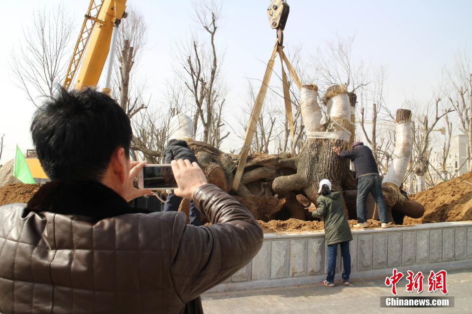 3月1日,一座重10余吨、长7米多的千年古槐树根盆景落地威海南海新区一水上乐园,吸引不少民众好奇关注。 中新社发 刘昌勇 摄