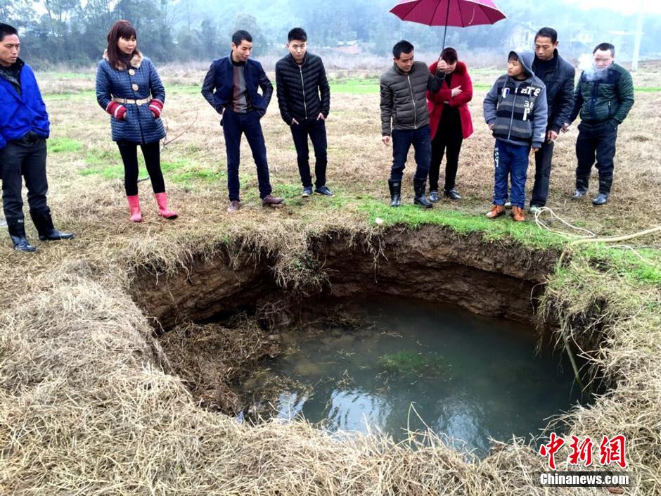2015年3月2日,在江西省万载县康乐街道东升村新发现一个深约8米、直径宽4米的大坑。目前,地陷的宽度和深度还在不断扩大。邓龙华 摄