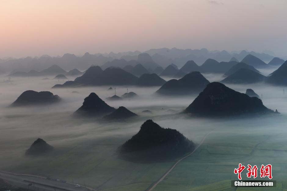 近日,云南省罗平县金鸡峰丛景区出现美丽云雾,峰林、云雾、飘渺虚幻,相映成趣,美不胜收。中新社发 毛虹 摄