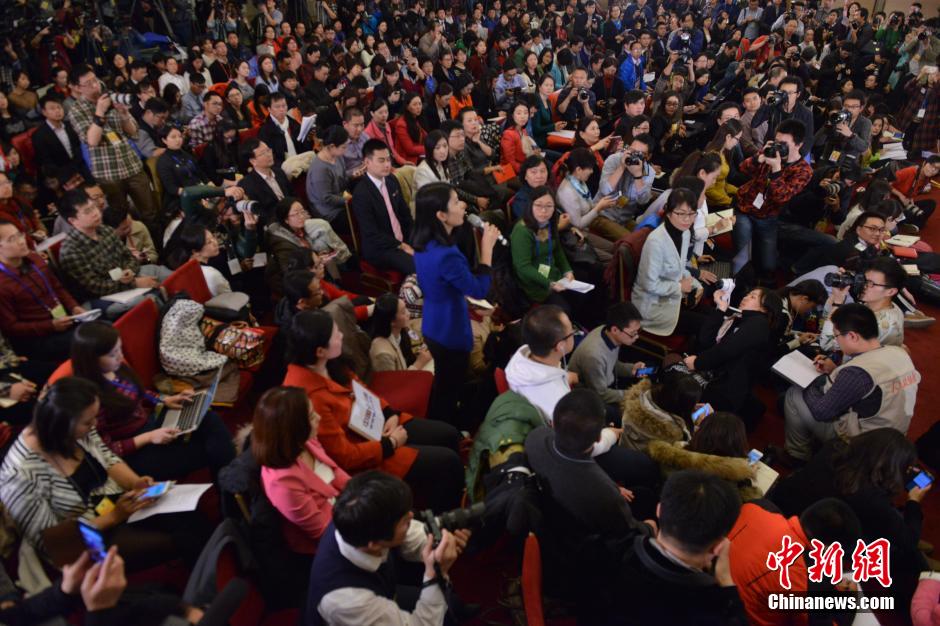 3月2日,全国政协十二届三次会议举行首次新闻发布会。记者现场提问。 中新社发 张浪 摄