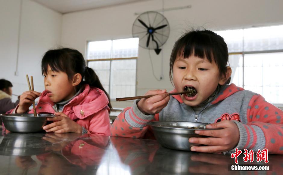 3月2日,在广西柳州市融安县长安镇太平小学,学生们在吃免费午餐。当日是2015年新学期开学的第一天,广西柳州市实施免费午餐扩面工程,继续扩大学生免费午餐受益面,将全市7所特教学校485名学生纳入免费午餐工程。目前,广西柳州市享受免费午餐学校1054所,受惠学生达18.32万人。谭凯兴 摄
