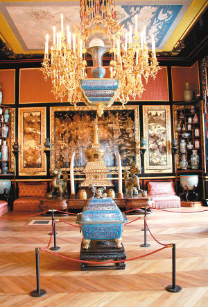 1863年,皇后决定将所有物品移放至枫丹白露宫侧殿的底层。据描述,在这座中国馆的主厅内,装饰天花板的是三张巨大的缂丝毯,织物华丽无比。
