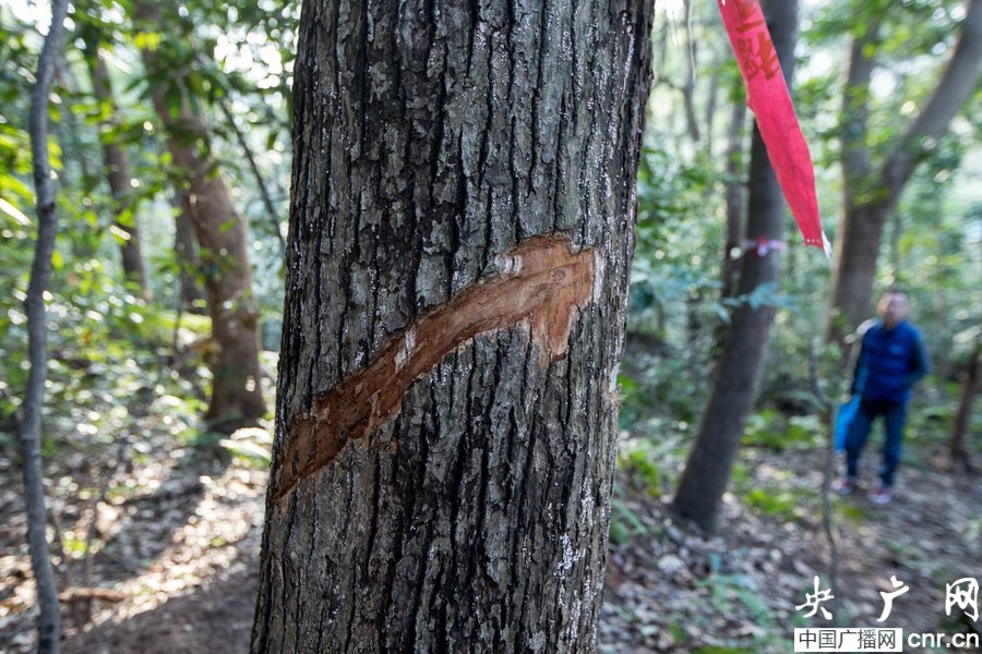 一眼望去,树干上被劈出了一个长宽各20厘米的箭头,因刻画箭头而裸露出的黄白色树体十分醒目。陶先生说,树木表皮坚硬,一般游客携带的小刀不可能造成这么大的破坏,他仔细看过这些“箭头”,都是用锋利的斧头劈出来的。