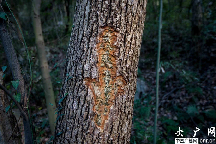 沿着这些箭头一路往南,手机上的GPS运动软件显示,这条被人为开辟的道路远离登山游步道,路两侧灌木密布,还有一些坟墓。记者在现场数了数,差不多有六十棵左右的树木躯干上都被刻了标记。陶先生怀疑,有人在这里组织了山地自行车或者登山活动,这些树上的箭头标记,就是举办者留下的。