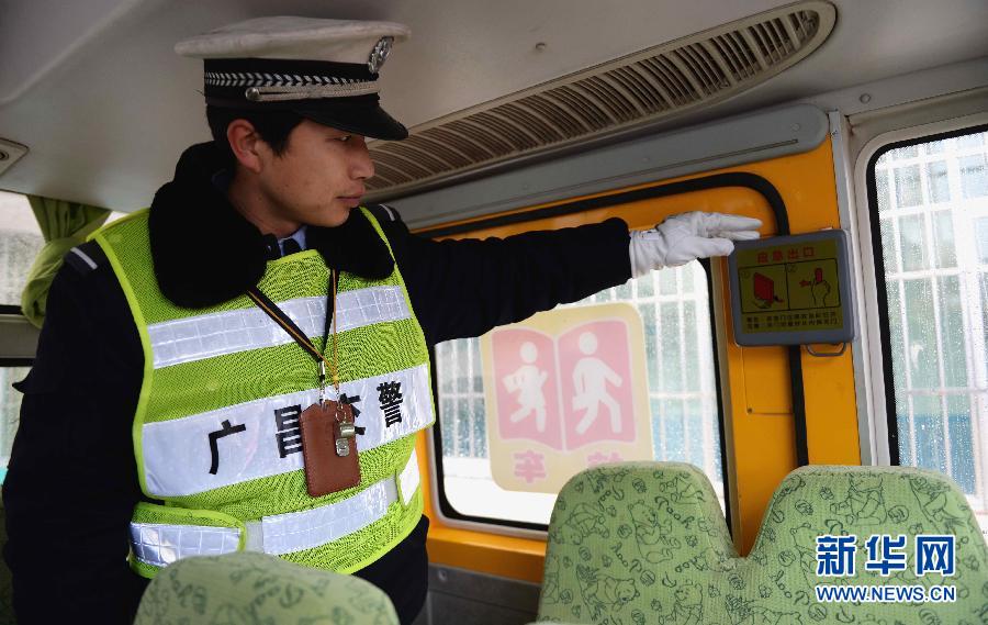 3月3日,在江西省广昌县永华学校,县公安交警大队干警在对该校校车的安全设施进行检查。近日,全国中小学校陆续开学。在开学前夕,江西省广昌县交警对多所城乡小学的校车进行安全检查,确保学生上下学的交通安全。 新华社记者陈子夏 摄