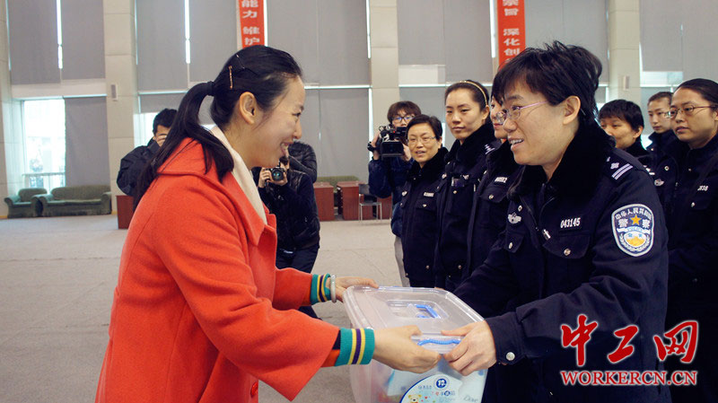 图为丰台区总工会副主席李洋为女民警送上大礼包。中工网记者 葛姗 摄