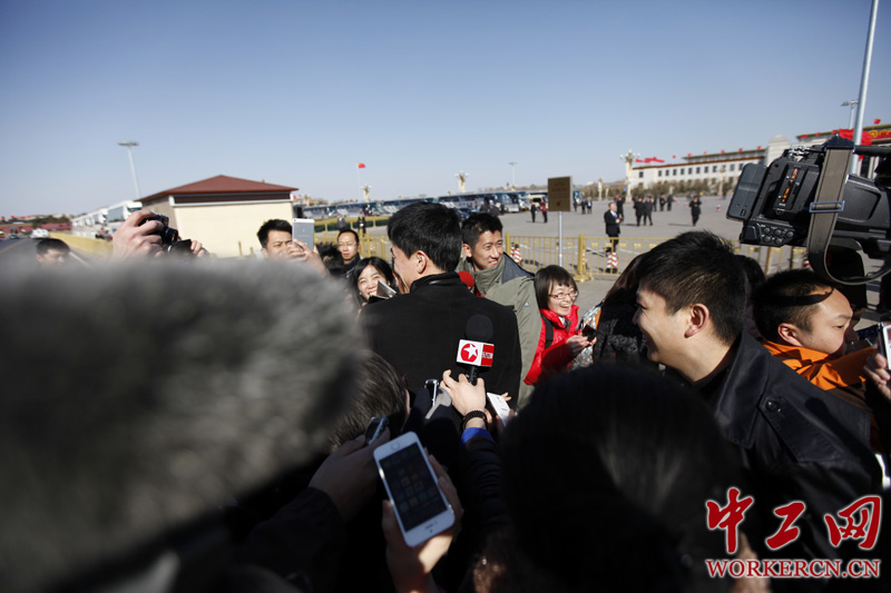 3月3日下午,全国政协十二届三次会议在人民大会堂举行开幕会。全国政协委员刘翔一出现就被记者围得寸步难行,就在这时,一个记者喊了一声,“姚明来了”,刘翔指着姚明的方向说,“对对对,姚明来了”,大部分记者向姚明走去,自己得以“抽身”。 (中工网记者 韩靖摄)