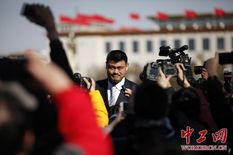 3月3日下午,全国政协十二届三次会议在人民大会堂举行开幕会。全国政协委员刘翔一出现就被记者围得寸步难行,就在这时,一个记者喊了一声,“姚明来了”,刘翔指着姚明的方向说,“对对对,姚明来了”,大部分记者向姚明走去,自己得以“抽身”。   (中工网记者 韩靖摄)