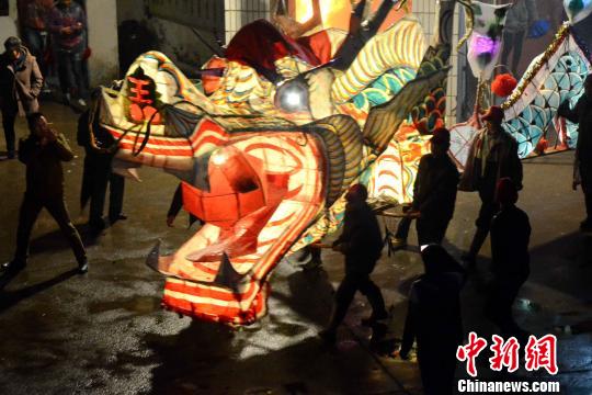3月3日晚,在客家祖地福建省连城县林坊乡,村民们抬着一条约200多米长的大龙环着村道游走,龙头高大威武,龙身五彩缤纷、栩栩如生。游龙是林坊乡的一项传统闹元宵民俗活动,有数百年历史。游龙时间为每年的正月十三到正月十五晚,意在祈求风调雨顺、国泰民安。