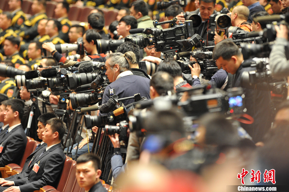 3月3日,全国政协十二届三次会议在北京人民大会堂举行开幕会。中外记者展开新闻大战。中新社发 张斌 摄