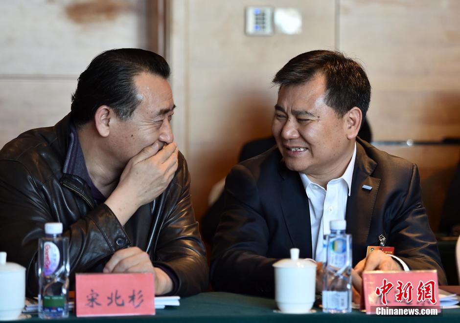 3月4日,全国政协委员分组讨论政协全国委员会工作报告。张近东、宋北杉在工商联分组讨论现场交谈。中新社发 翟羽佳 摄