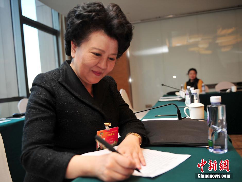 3月4日,全国政协委员分组讨论政协全国委员会工作报告。全国政协常委、国务院侨办主任裘援平参加分组讨论。会后她认真做总结。中新社发 翟羽佳 摄