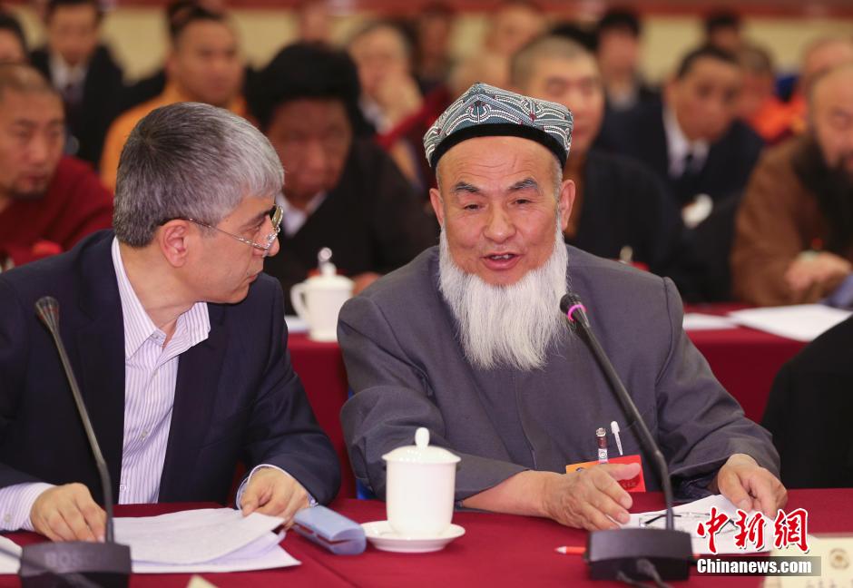 3月4日,中共中央政治局常委、全国政协主席俞正声在北京参加全国政协十二届三次会议宗教界别小组讨论。图为全国政协委员、新疆吐鲁番地区伊斯兰教协会会长白克力·马木提(右)在会上发言。白克力·马木提。中新社发 杜洋 摄