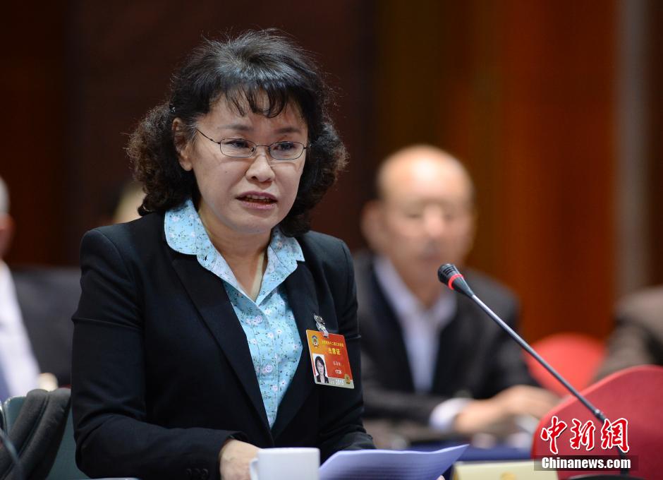 3月4日,全国政协十二届三次会议总工会、福利保障界别举行联组会。全国政协常委、中国残联主席张海迪发言。中新社发 侯宇 摄
