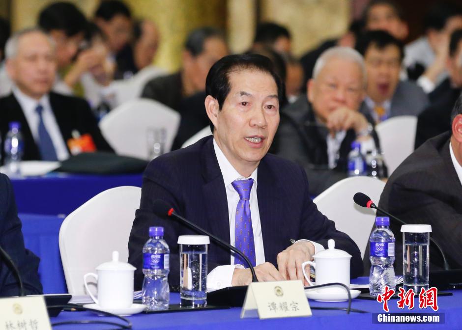 3月4日,中共中央政治局常委、全国人大常委会委员长张德江在北京参加全国政协十二届三次会议港澳委员联组会议。香港荣利集团董事局主席卢文端在会议上发言。中新社发 杜洋 摄