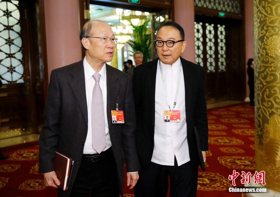 3月4日,中共中央政治局常委、全国人大常委会委员长张德江在北京参加全国政协十二届三次会议港澳委员联组会议。全国政协委员、澳门博彩股份有限公司董事局主席苏树辉(左)、全国政协委员、澳门生产力暨科技转移中心主席杨俊文参加会议。中新社发 杜洋 摄