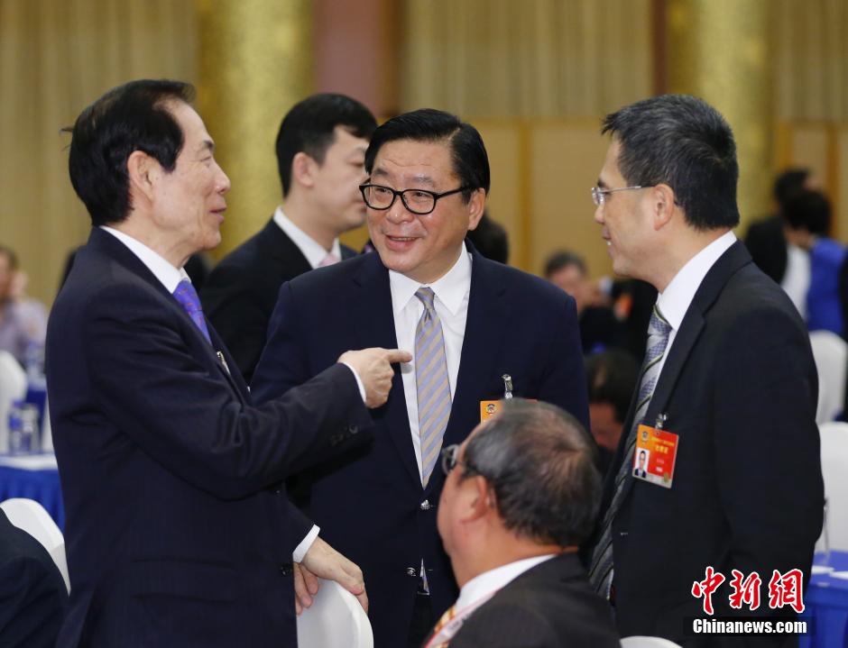 3月4日,中共中央政治局常委、全国人大常委会委员长张德江在北京参加全国政协十二届三次会议港澳委员联组会议。卢文端委员(左)、林健锋委员(中)、李泽钜委员(右)在会前交流。中新社发 杜洋 摄