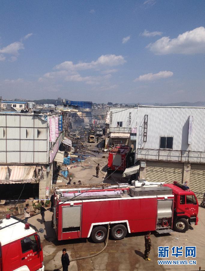 这是3月4日拍摄的东盟联丰农产品商贸中心火灾现场(手机照片)。 3月4日凌晨,昆明市官渡区彩云北路1502号东盟联丰农产品商贸中心发生一起火灾,已造成9人死亡,10人受伤,50余间商铺被烧毁。经全力扑救,现火灾已扑灭,伤员已得到及时妥善救治。目前,火灾事故调查、伤员救治、现场清理及善后处理工作正在进一步开展中,商场及商铺相关人员已被公安机关控制。 新华社记者 吉哲鹏 摄