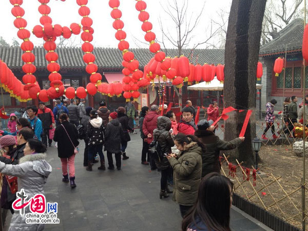 雅园里的大红灯笼与红色的灯谜交相辉映,处处散发着浓浓的年味,吸引游客们纷纷驻足拍照留影。在欢快的音乐中,大人和孩子们各个争先恐后猜谜语、击鼓祈福、投壶射箭、还有穿着古装穿越…….游客们喜笑颜开,欢乐开怀,成为王府内一道亮丽的风景线,为冬日的恭王府增添了喜庆祥和的节日气氛。(伍策 李凤森)