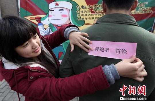 大学生们相互贴上“奔跑吧,雷锋”铭牌参加志愿行动。泱波 摄