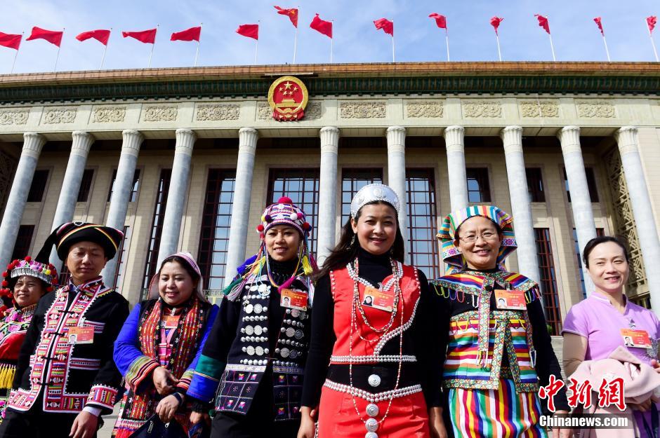 3月4日上午,全国人大少数民族妇女代表在北京人民大会堂参加十二届全国人大三次会议预备会。 中新社发 陈文 摄