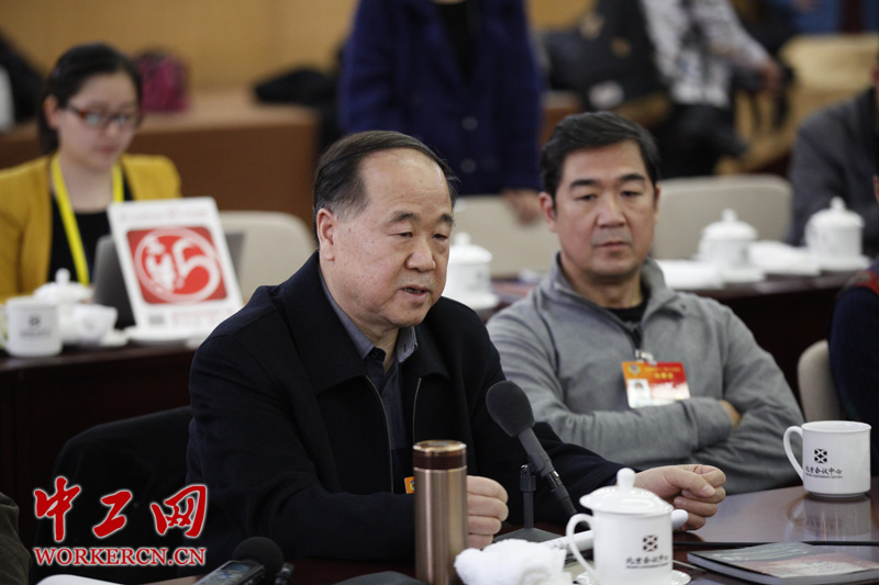 3月4日下午,全国政协十二届三次会议召开小组讨论会,文艺界别政协委员莫言发言,希望学前教育纳入到免费教育体系中。   (中工网记者 韩靖摄)