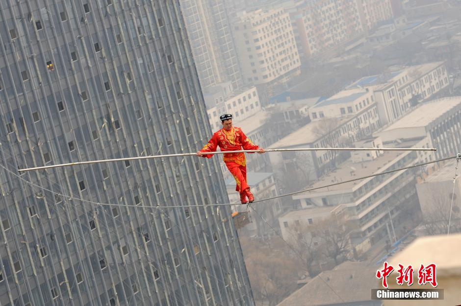 3月5日,山西太原万达中心,高空王子阿迪力家族、达瓦孜第七代传人赛买提在距离地面190米的高空上演真人钢丝秀,场面惊险刺激。韦亮 摄