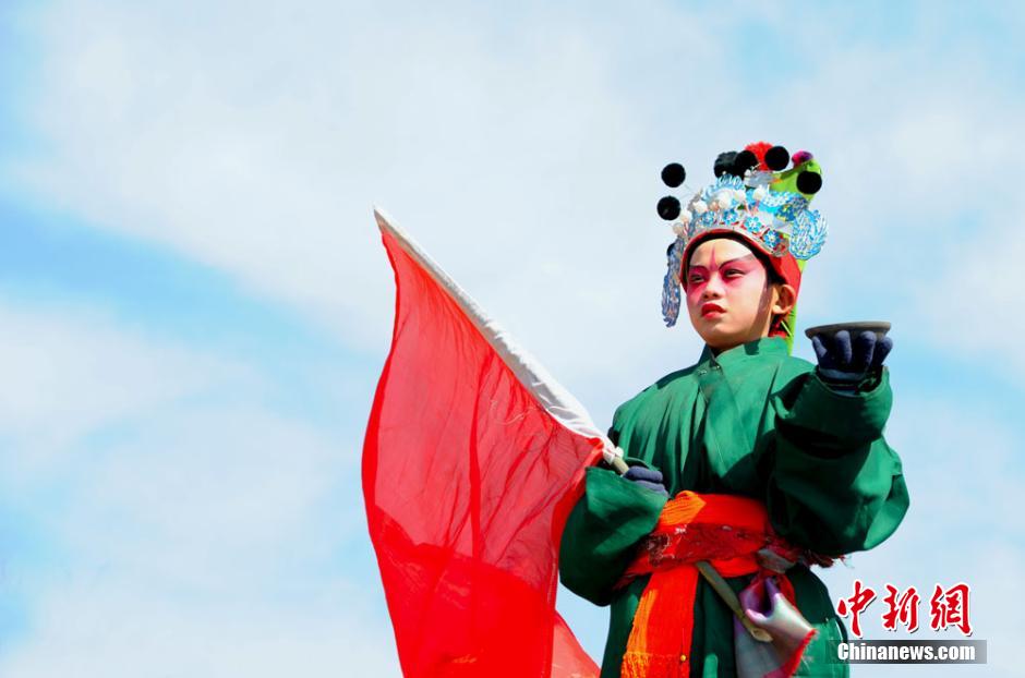 元宵佳节,甘肃秦安县三棵树村村民民俗社火表演开展得如火如荼,精彩纷呈。每年正月,该村都要进行社火表演,这是当地庆祝春节的传统庆典活动,村民们自己动手,用彩纸、绸布做出各种造型,有树林、假山、动物等,绘制出一面面五彩缤纷、古朴典雅的社火脸谱,身着戏服,其造型粗犷,纹样稚拙,色彩浓烈,给人一种更原始、更清新、更自由之感。 师永红 摄