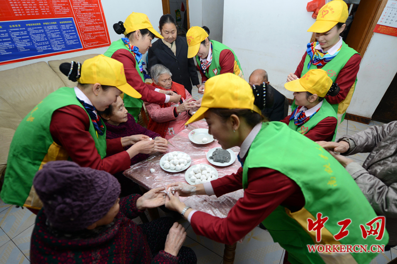 图为3月4日,志愿者与孤寡老人一起包汤圆。通讯员 鲍赣生摄