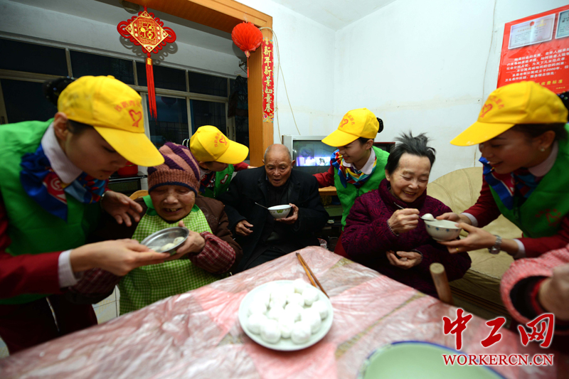 3月4日,志愿者将烧好的汤圆端给老人们。