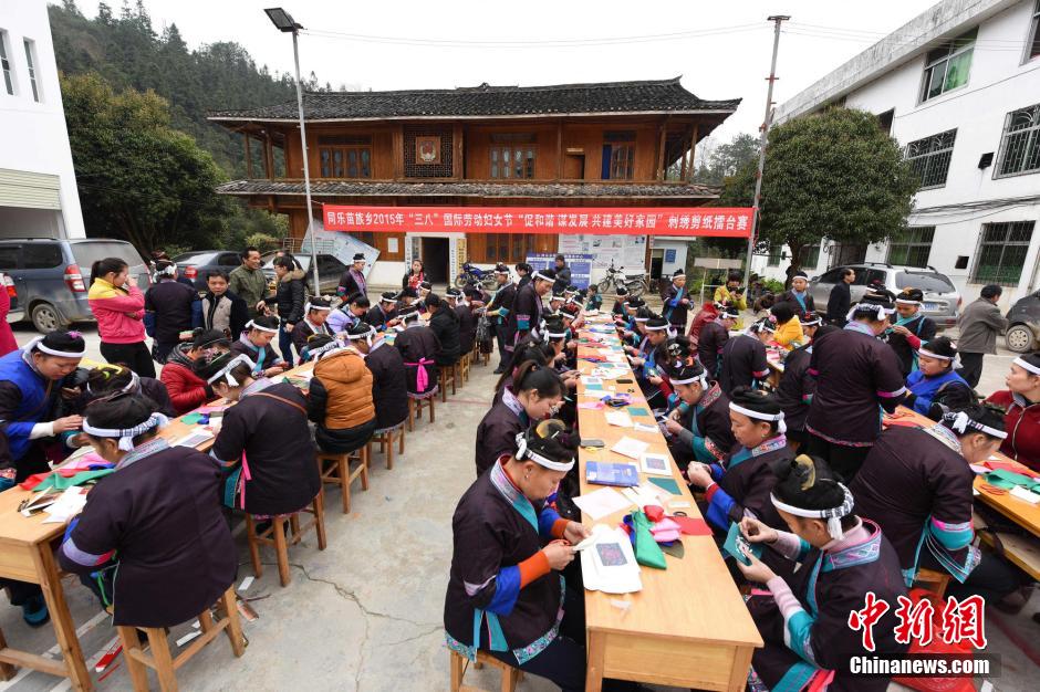 3月4日,广西三江侗族自治县同乐乡的100名绣娘进行刺绣比赛,用竞绣技的方式迎接“三八”妇女节的到来。侗绣是刺绣的一种,全用手工一针一线在侗布上刺绣出色彩斑斓的作品。侗绣的图案以花鸟及几何图案为主,有的也绣人物建筑图案,是侗族历史文化发展的见证。吴练勋 摄