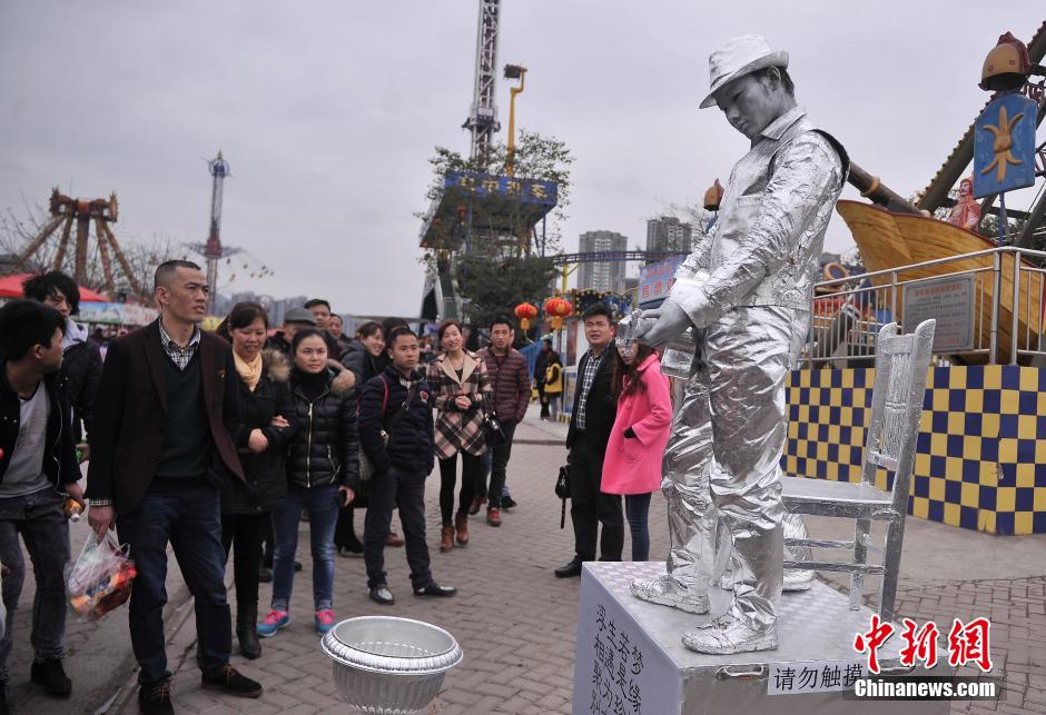 3月5日,重庆街头一小伙子脸上涂满了银白色的液体,身前摆放了一个装着许多零钞的圆桶,身着银白色的服装,手上拿了一把吉他,一动不动的坐着,吸引了不少游客围观。 中新社发 陈超 摄