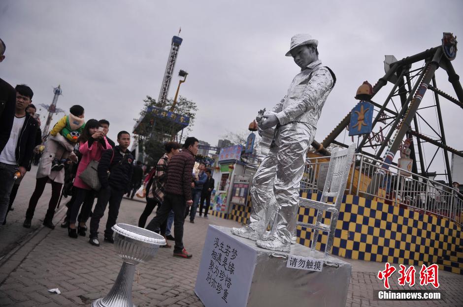 3月5日,重庆街头一小伙子脸上涂满了银白色的液体,身前摆放了一个装着许多零钞的圆桶,身着银白色的服装,手上拿了一把吉他,一动不动的坐着,吸引了不少游客围观。 中新社发 陈超 摄