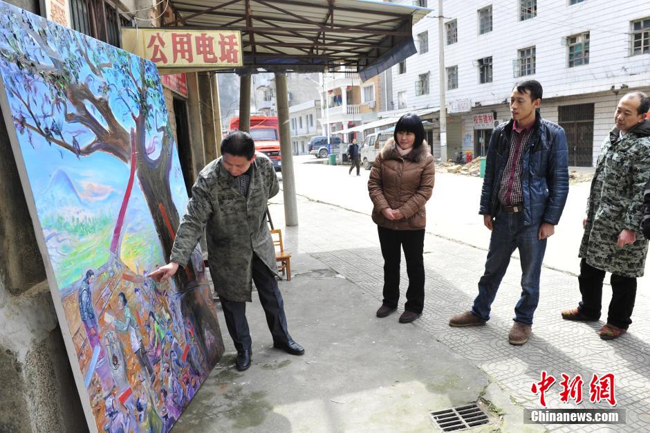 屈万荣向附近居民讲解他的油画。王康明 摄