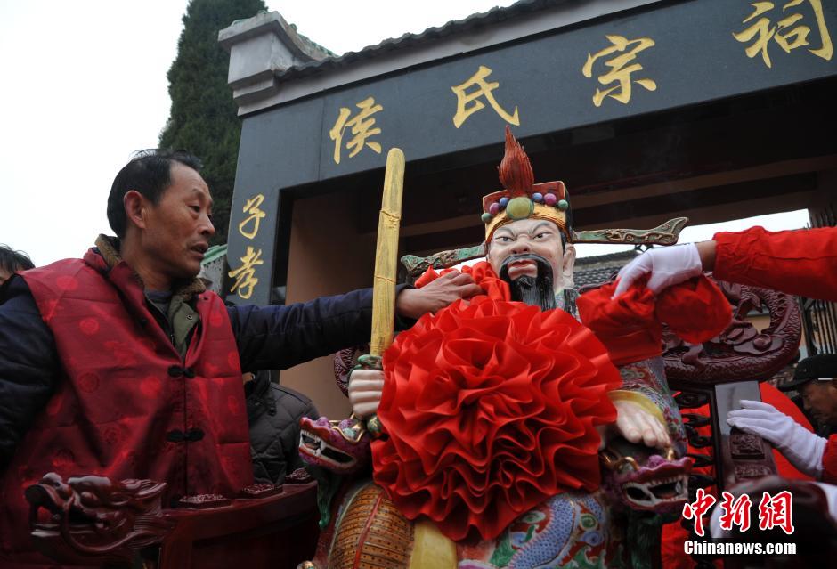3月5日,农历正月十五元宵节,居住在安徽省合肥市肥东县沿河村一带的候氏村民们在田间地头舞狮弄棒、敲锣打鼓,壮汉们抬着祖先的塑像开始一年一度的祭祖祈福、“打年将”活动。中新社发 韩苏原 摄