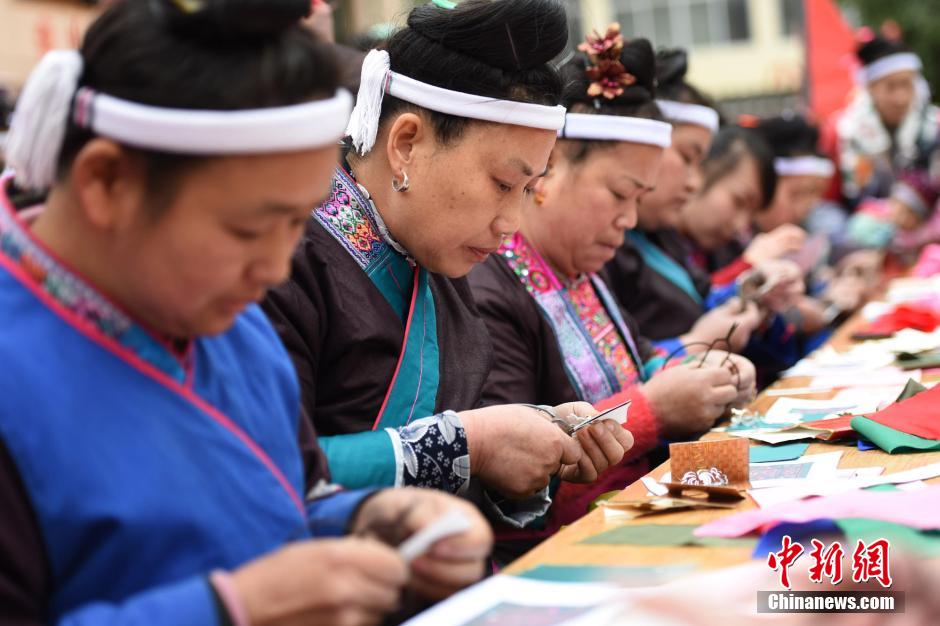 3月4日,广西三江侗族自治县同乐乡的100名绣娘进行刺绣比赛,用竞绣技的方式迎接“三八”妇女节的到来。杨明 摄