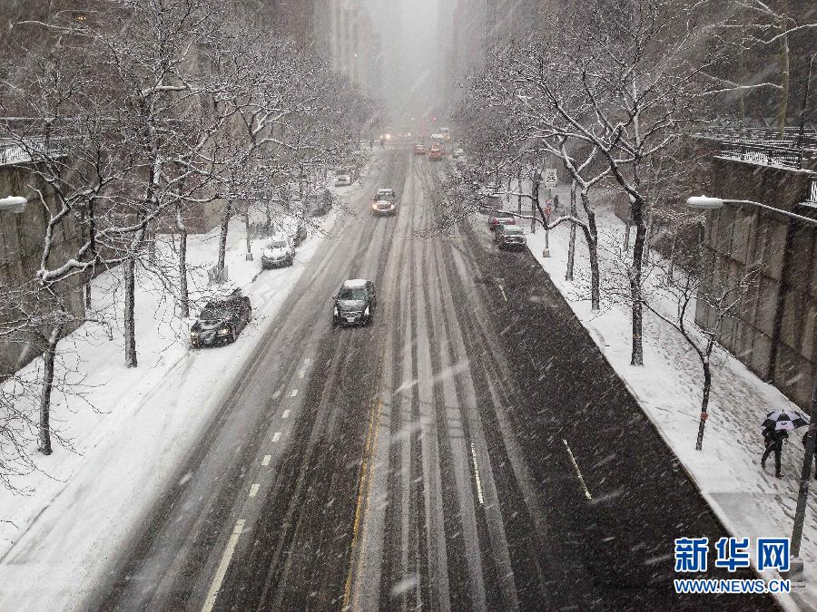 3月5日,在美国纽约曼哈顿,车辆在大雪中前行(手机拍摄)。当日,美国东部纽约州、新泽西州和康涅狄格州再次遭遇暴风雪,近千航班被取消。 新华社记者牛晓雷摄