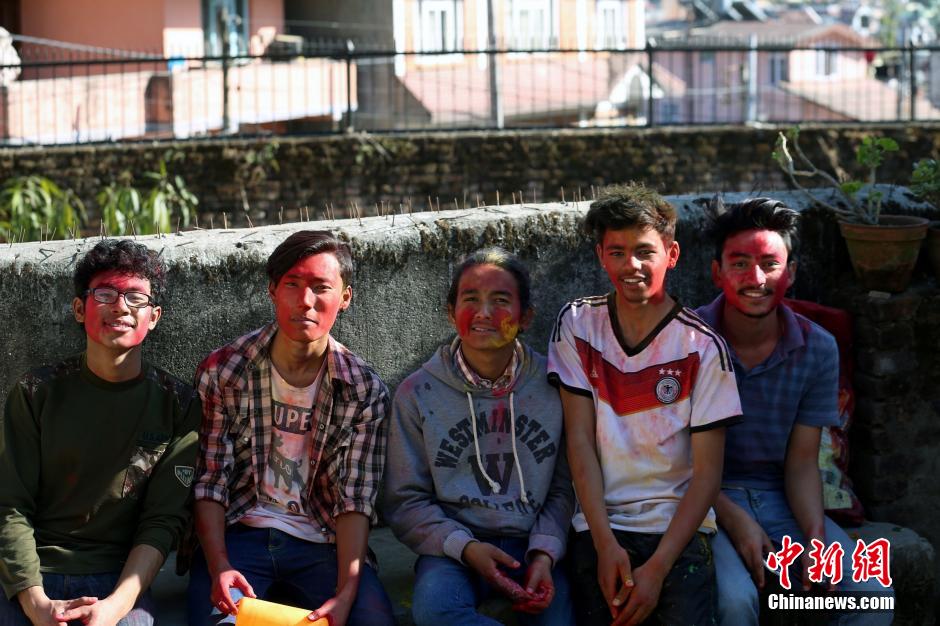 图为3月5日几位年轻人在加德满都街头玩耍。中新社发 符永康 摄