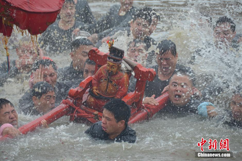 3月5日,在福建漳州龙海九湖镇林前村,一年一度的伽蓝王巡社庆典如期举行。庆典活动中,从明朝一直延续至今的“汉族泼水节”,成为村民们最期待的环节。抬着伽蓝王神像的年轻人不惧泼水,勇往直前。如此循环往复,神像一共入水3次,才被村民们簇拥着送回伽蓝庙里。据介绍,龙海林前村伽蓝王巡社庆典历史悠久,相传是“开漳圣王”陈元光为安抚当地的畲民,将汉族佛教道教中的“抬神像巡游”活动与畲人的泼水合二为一,发展为如今的泼水节。余丹 摄
