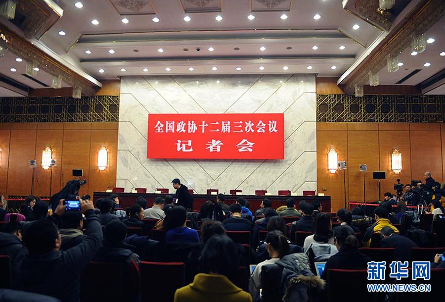 3月6日下午2时30分,全国政协十二届三次会议召开记者会,邀请全国政协常委厉以宁、李毅中、陈锡文、林毅夫以及全国政协委员杨凯生、常振明、贾康谈主动适应经济发展新常态促进经济平稳健康发展并回答记者提问。图为记者会现场。新华网/中国政府网 翟子赫 摄 图片来源:新华网