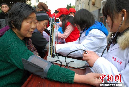 江苏大学志愿者在为社区居民义诊。 石玉成 摄