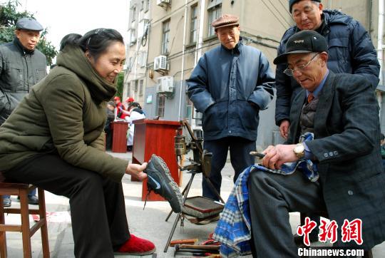 66岁的志愿者冷广山在为居民义务修鞋。 石玉成 摄