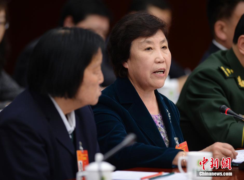 3月6日,参加十二届全国人大三次会议的山西省代表团在北京举行全体会议,审议政府工作报告。全国人大代表、山西省昔阳县大寨村的党总支书记郭凤莲参加会议。中新社发 侯宇 摄