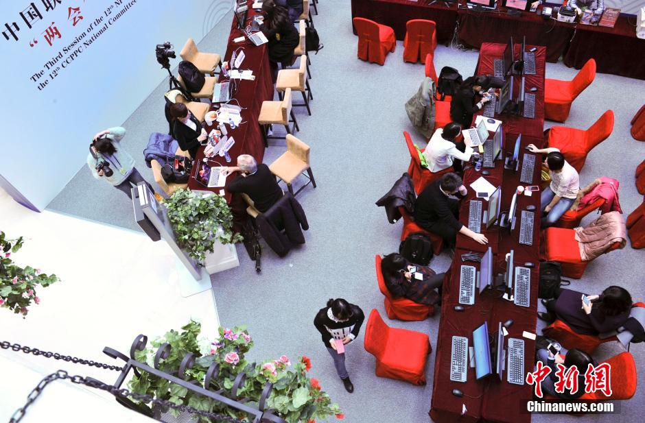 3月6日,参加第十二届全国人民代表大会第三次会议和全国政协第十二届全国委员会第三次会议采访的记者紧张地忙碌发稿。中新社发 张斌 摄