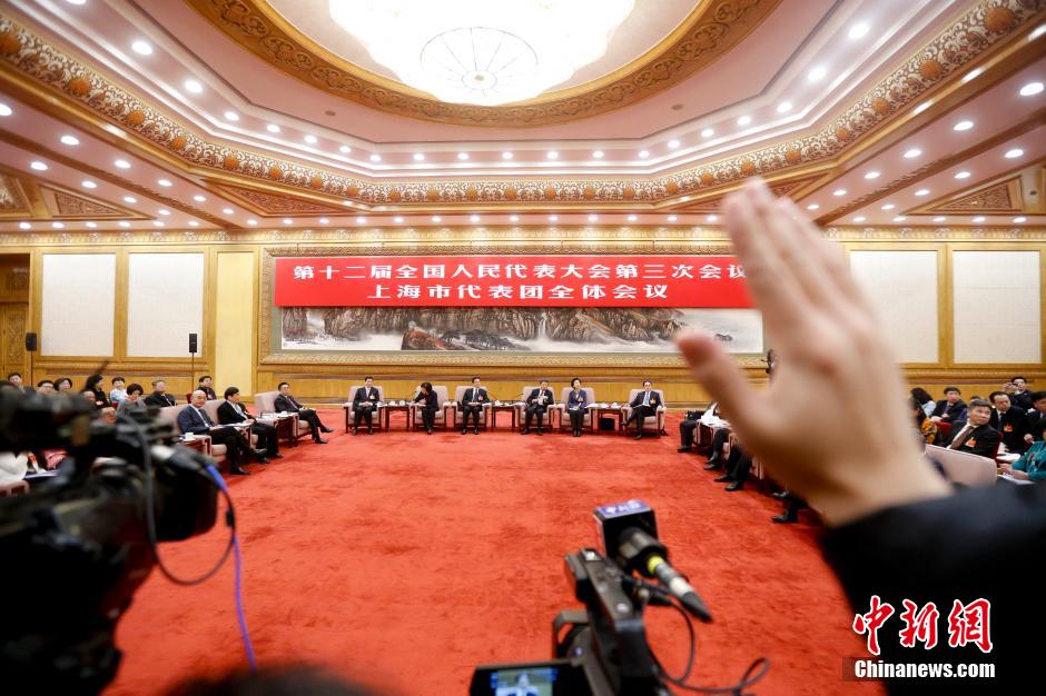 3月6日,出席十二届全国人大三次会议的上海代表团在人民大会堂举行全体会议,审议政府工作报告。中新社发 杜洋 摄